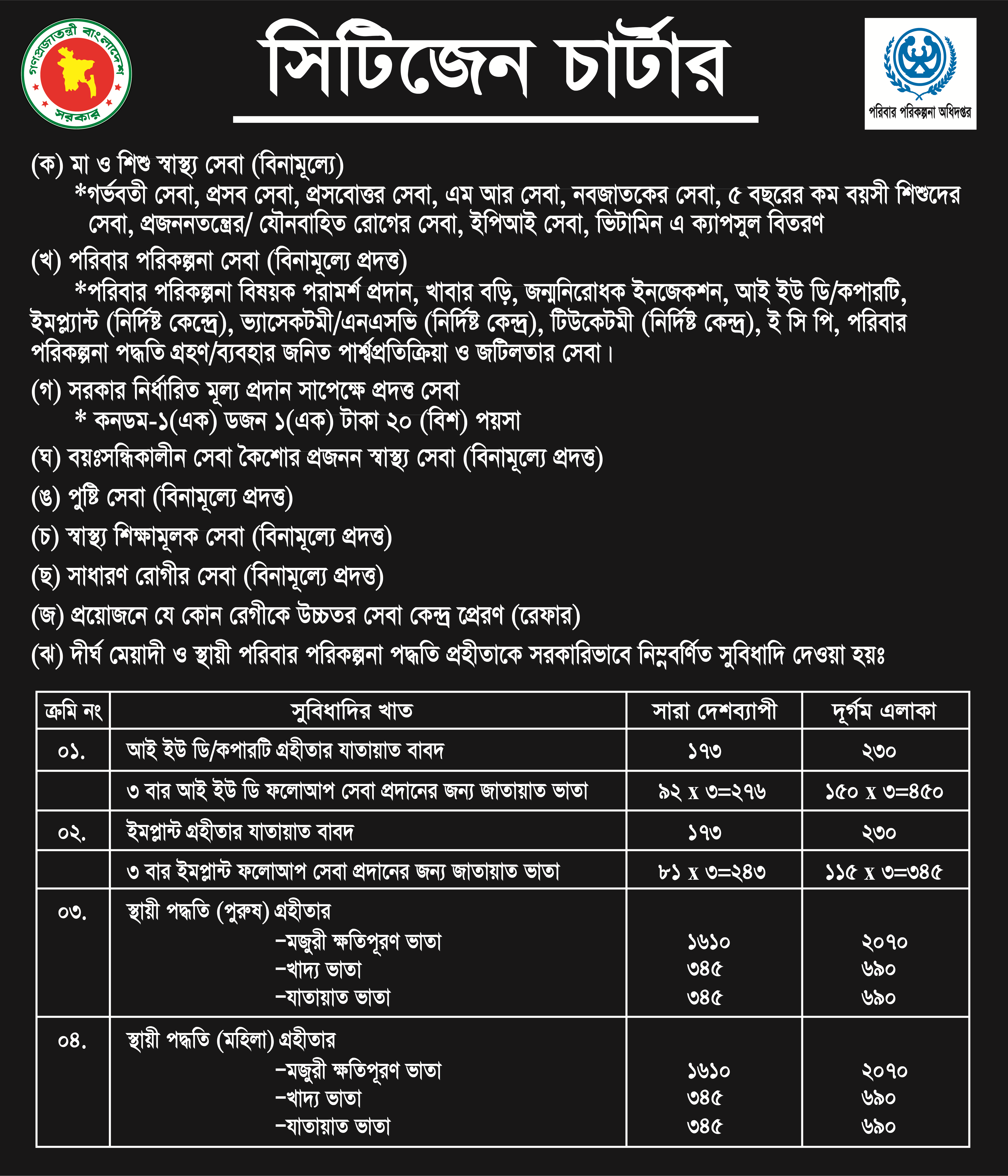 | ১ | পরিবার পরিকল্পনা,মা ও শিশু স্বাস্থ্য কর্মসূচী বাসত্মবায়ন,ব্যবস্থাপনা উপকরন,অর্থ,তথ্য ও কর্মচারী ব্যবস্থাপনা পরিচালনা,নিয়ন্ত্রন, তদারকী,পরিবেক্ষণ এবং সমন্বয়। | দম্পতি,মা ও শিশু এবং কিশোর কিশোরী। | ঊপজেলা পরিবার পরিকল্পনা কর্মকর্তা। | রবি - বৃহঃ ৯টা হতে ৫টা। | কনডম ব্যতীত বিনা মূল্যে। | উপজেলা স্বাস্থ্য কমপ্লেক্স, ইউনিয়ন স্বাস্থ্য পঃ কঃ কেন্দ্র স্যাটেঃ ক্লিনিক, বাড়ী বাড়ী |